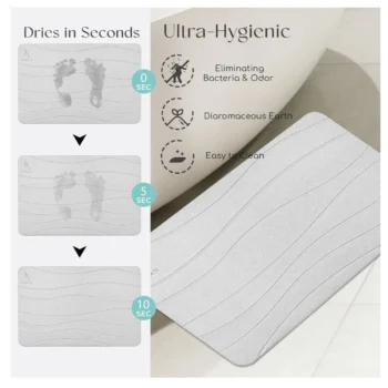 Este tapete de secado rápido es la solución perfecta para colocar en el baño, la cocina o cualquier espacio donde el agua pueda ser un problema. Su diseño moderno y minimalista combina estilo y funcionalidad.
